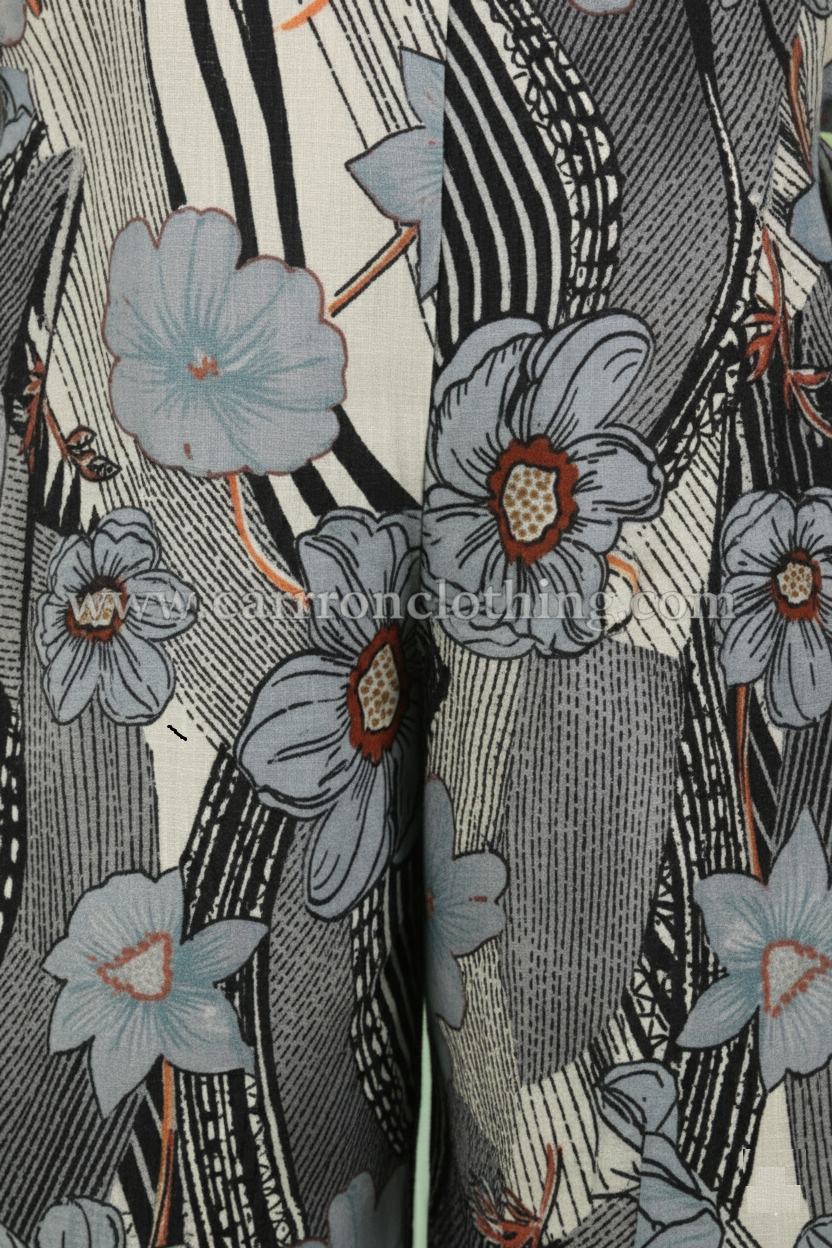 Print Technique: Digital screen printing, allowing for the sharp contrast between the organic floral shapes and the rigid geometric lines in the background.