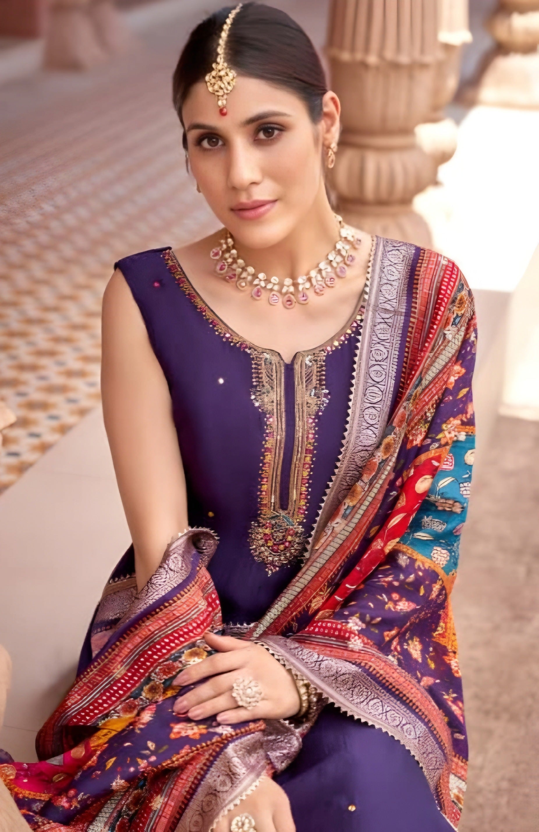 This outfit is a classic example of contemporary Indian formal wear, likely crafted for weddings, festive occasions, or high-end evening events. It features a minimalist solid-toned base paired with an intricately detailed, multi-colored dupatta that acts as the focal piece.