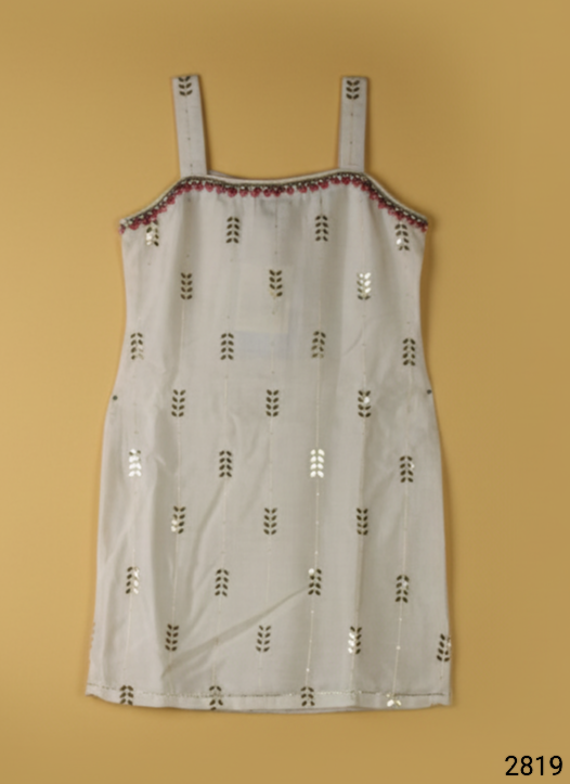Top  A sleeveless, straight-cut tunic with wide shoulder straps. It features a square neckline adorned with a delicate pink and gold embroidered border. The front is decorated with vertical rows of small gold leaf/foil motifs.