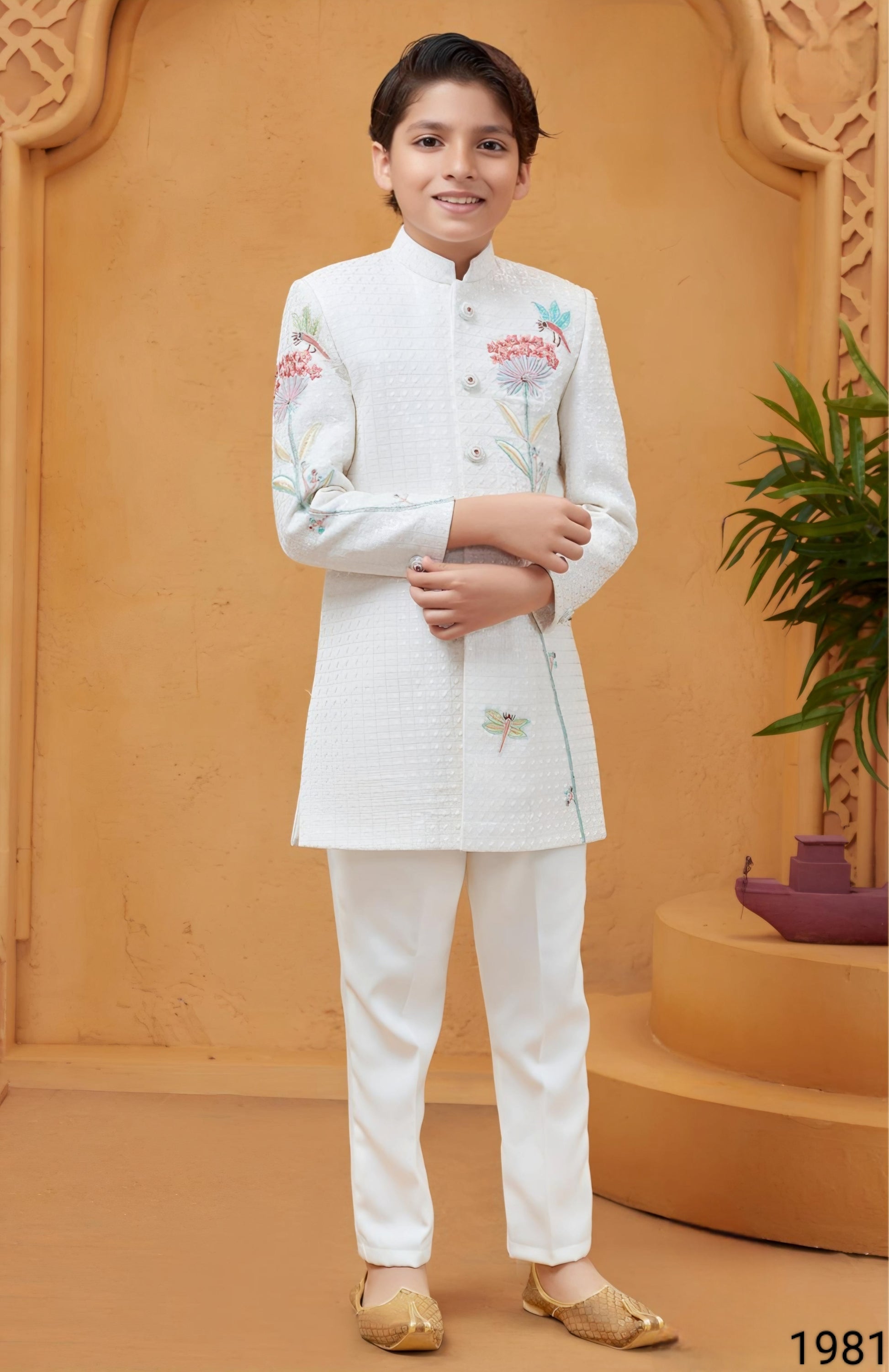 This is a sophisticated Boys' Indo-Western Sherwani Set, perfect for formal occasions like weddings, festivals,celebratory events. It blends traditional Indian silhouettes with modern, clean aesthetics.