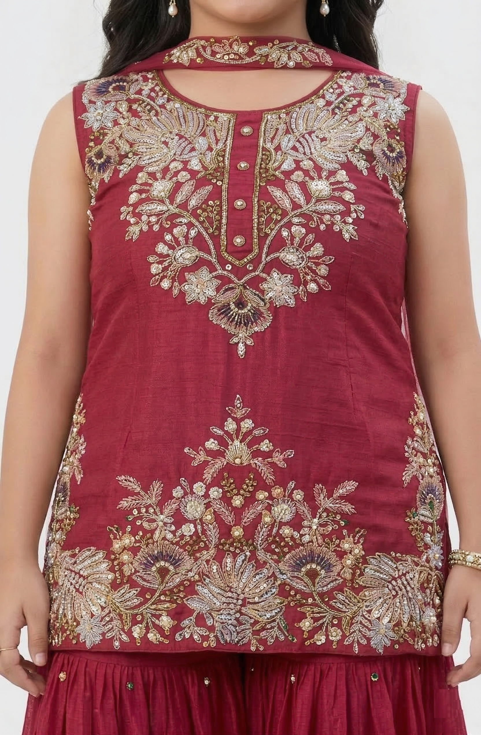 This is an elegant Girls' Gharara Set in a deep maroon shade, perfect for festive occasions and weddings.
