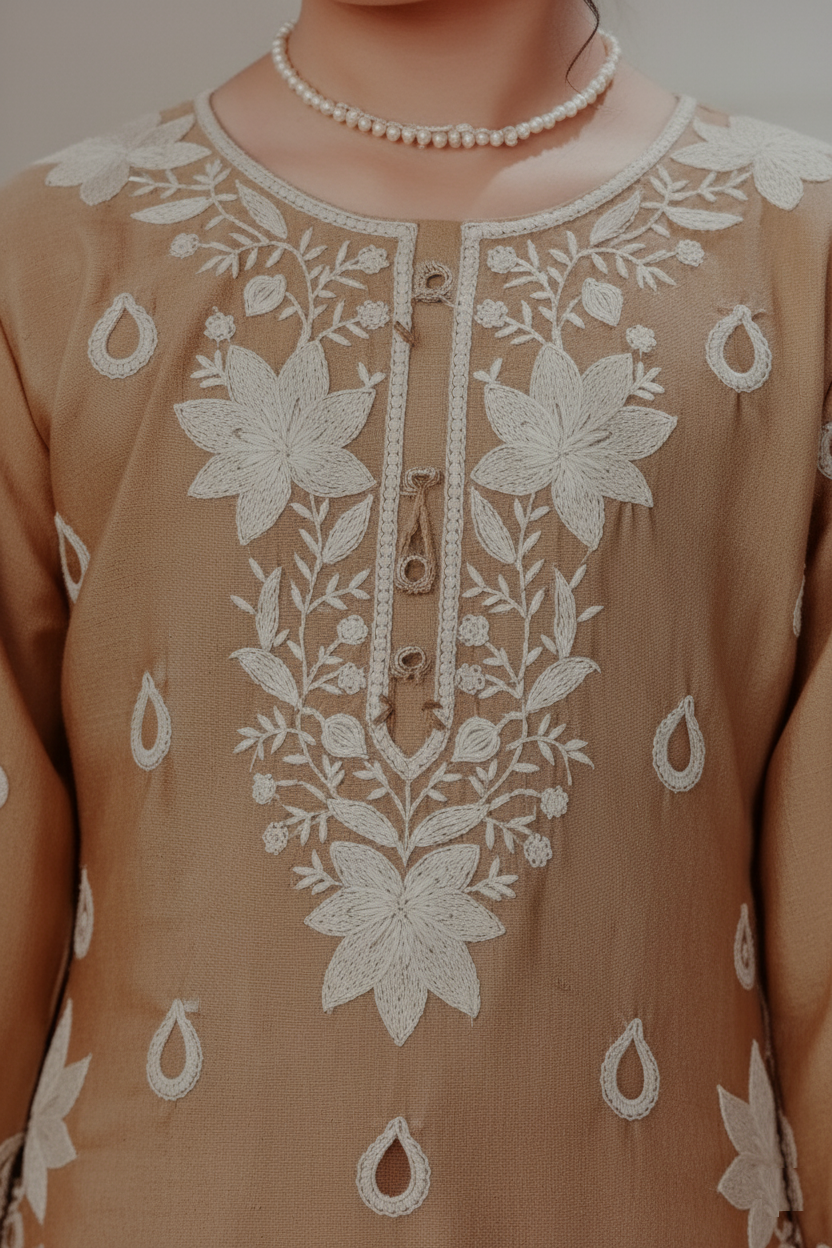 This is a perfect example of Modern-Traditional fusion. While the silhouette (Patiala) is very traditional, the monochromatic color scheme fawn is contemporary and elegant, making it suitable for weddings, festive celebrations, or formal events.