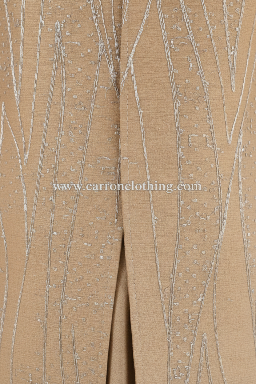 Pattern: The garment is adorned with vertical wavy embroidery. These patterns is created with fine silver, white beadwork and sequins, giving the outfit a subtle "shimmer" effect rather than an overwhelming shine.