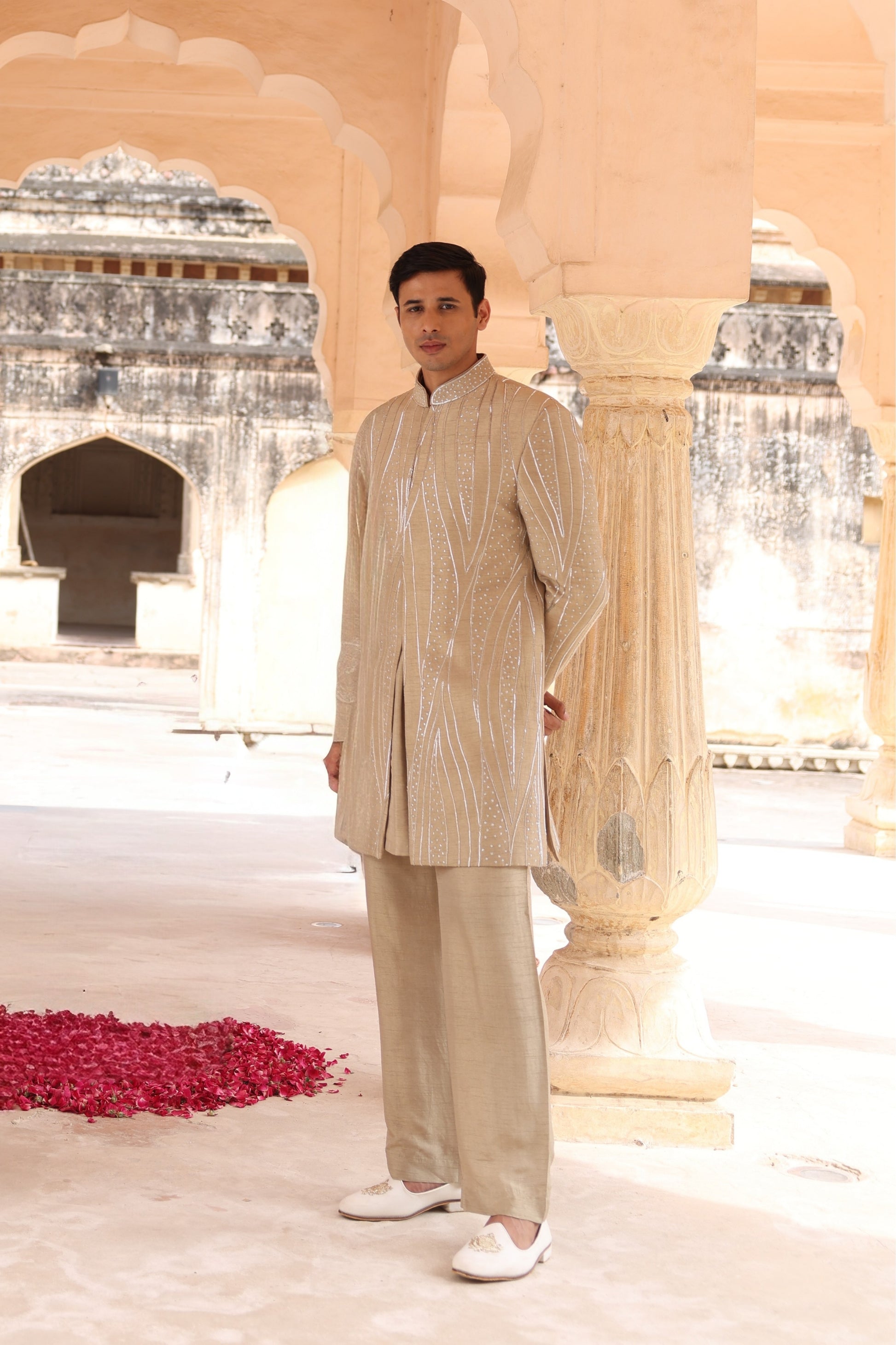 This is a sophisticated and modern take on traditional Indian groom’s wear, a beaded Indo-Western.