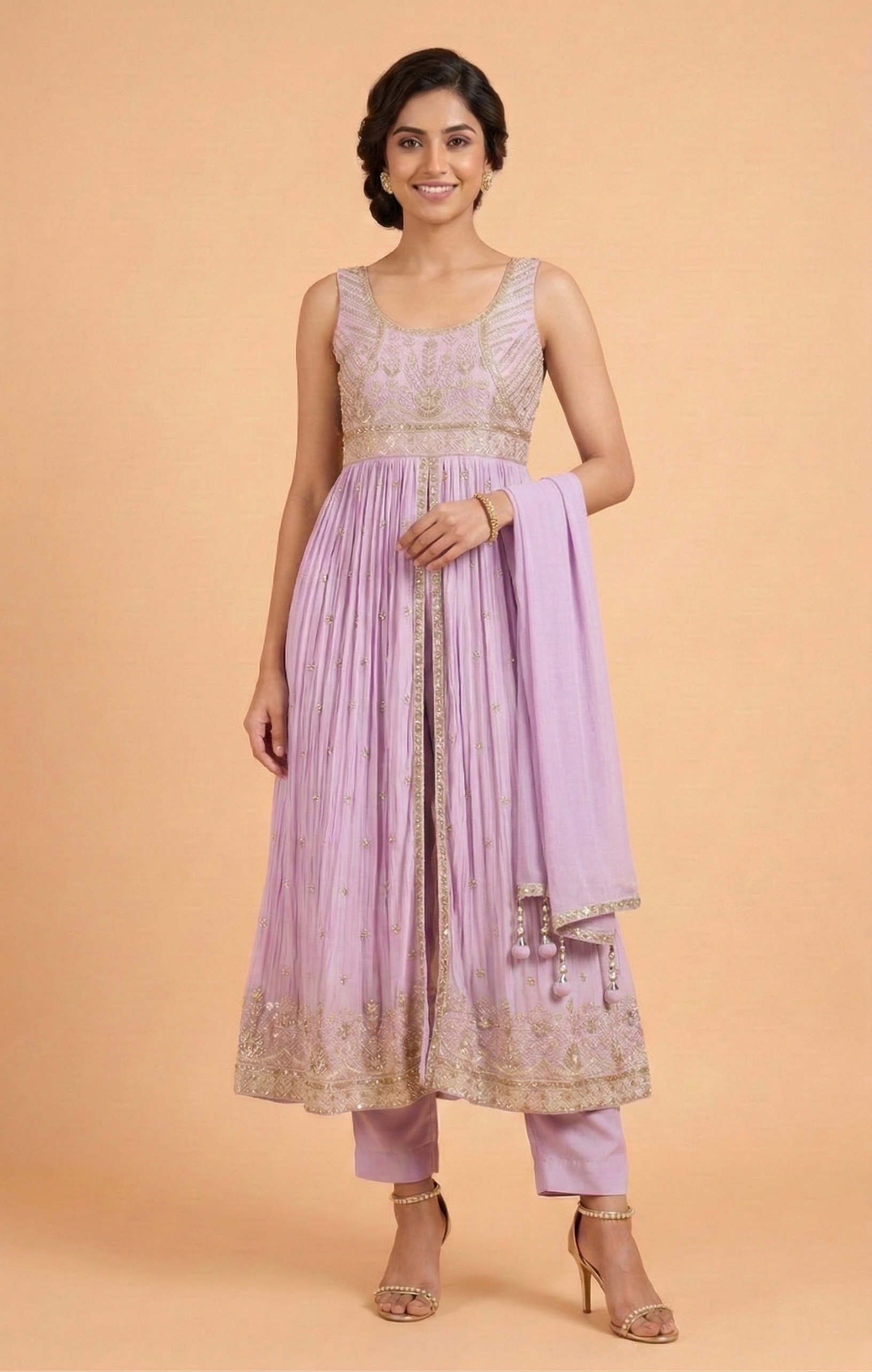 Bodice: Features a sleeveless, round-neck design heavily adorned with intricate Zari and Sequin embroidery. The gold-toned floral motifs provide a rich contrast against the lavender base.