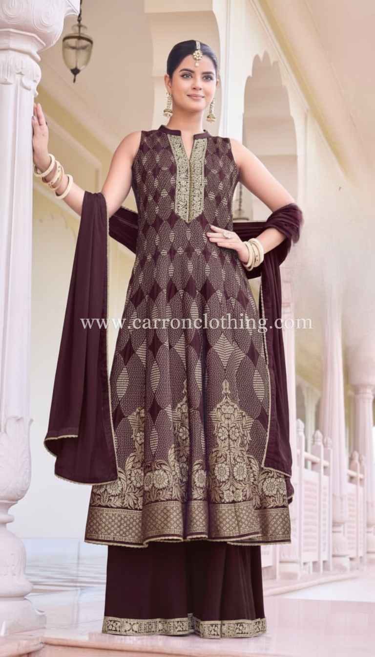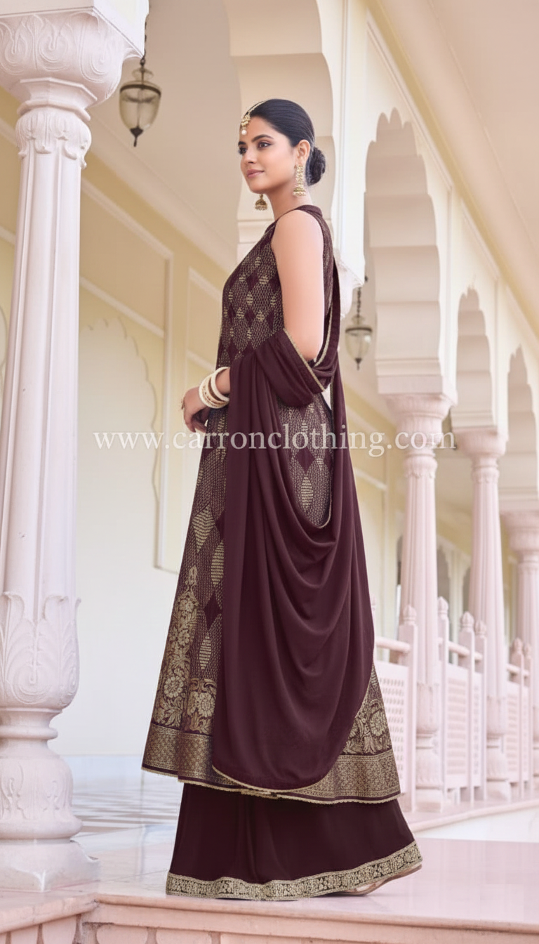 This elegant outfit is a Magenta Colored Plazo Set. It is a sophisticated three-piece ethnic ensemble designed for festive occasions or formal gatherings.