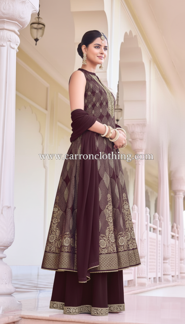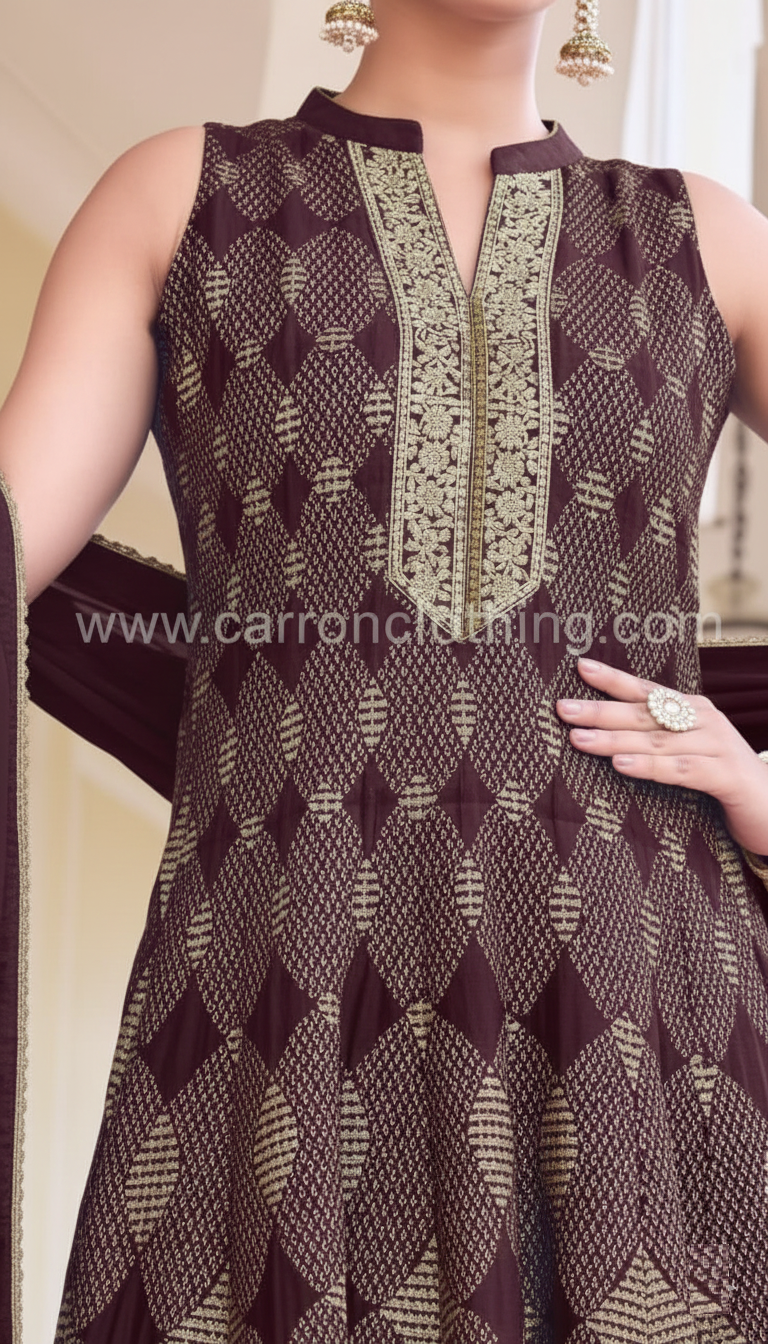 Silhouette: A floor-length, sleeveless Anarkali-style kurta with a heavy flare.