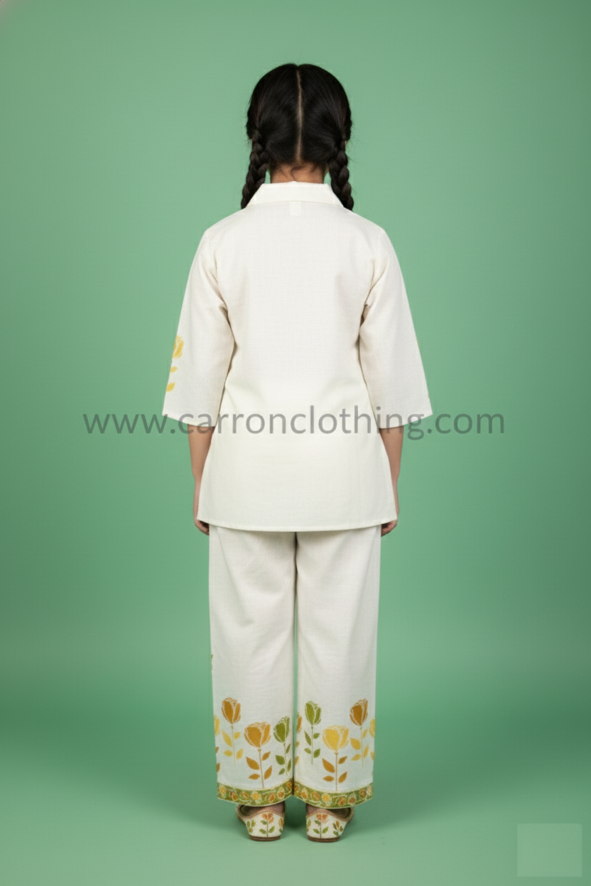 The set has a fresh appeal, perfect for daytime events, festive gatherings, or comfortable everyday wear. The yellow and green floral design stands out beautifully a light base color.