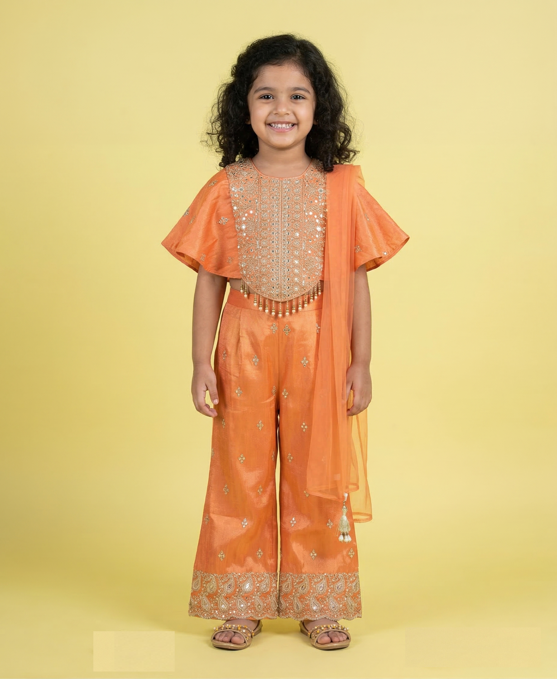 This is a vibrant and elegant ethnic ensemble for girls, featuring a modern take on traditional Indian wear. The outfit consists of a cropped top, wide-leg trousers (Plazo style), and a matching dupatta.