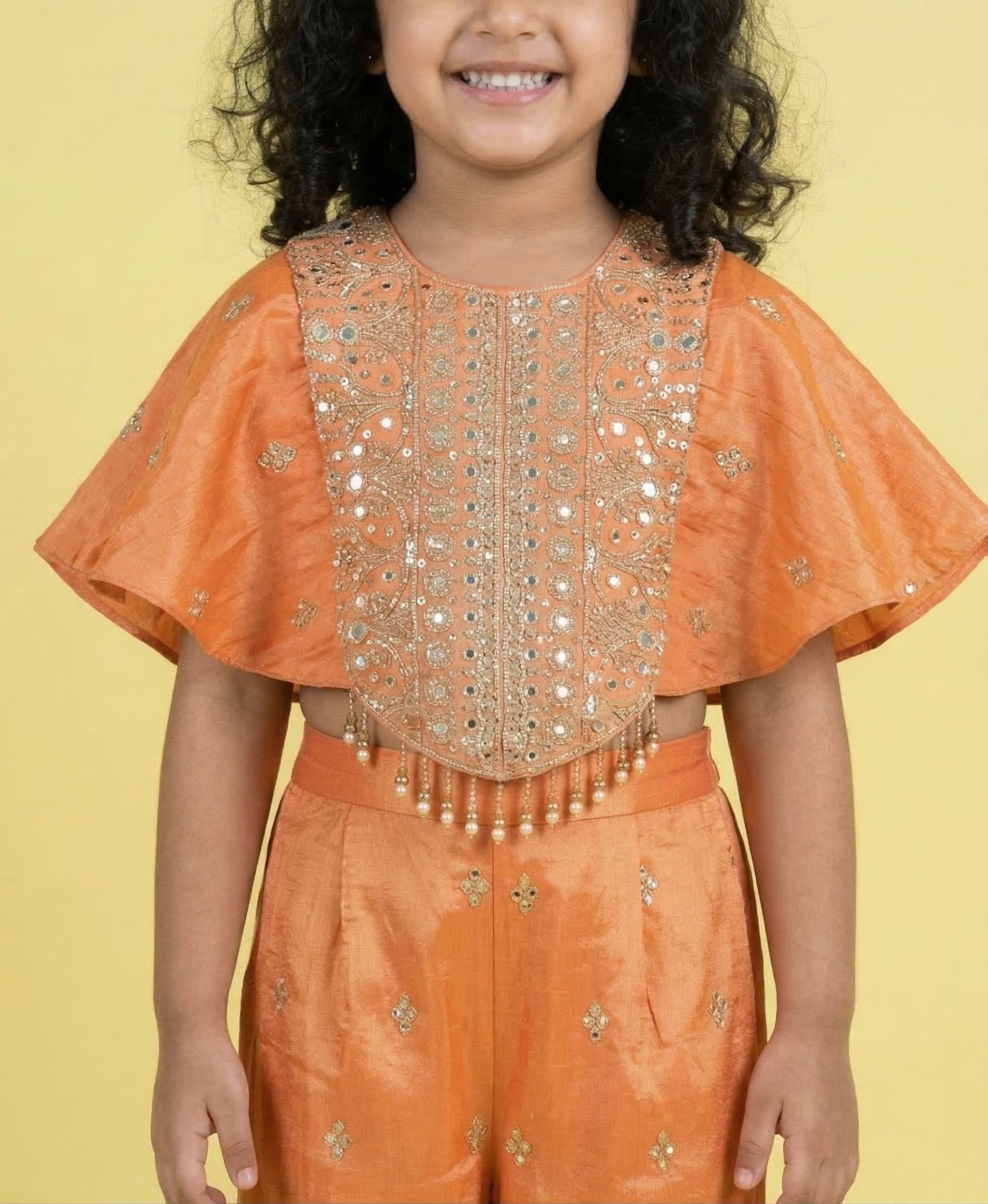 Top (Crop Top): The top features a unique scalloped hemline adorned with hanging bead droplets . It is heavily embellished with intricate gold embroidery and mirror-work on the bodice. The sleeves are a short, flared butterfly style, providing a breezy and contemporary look.