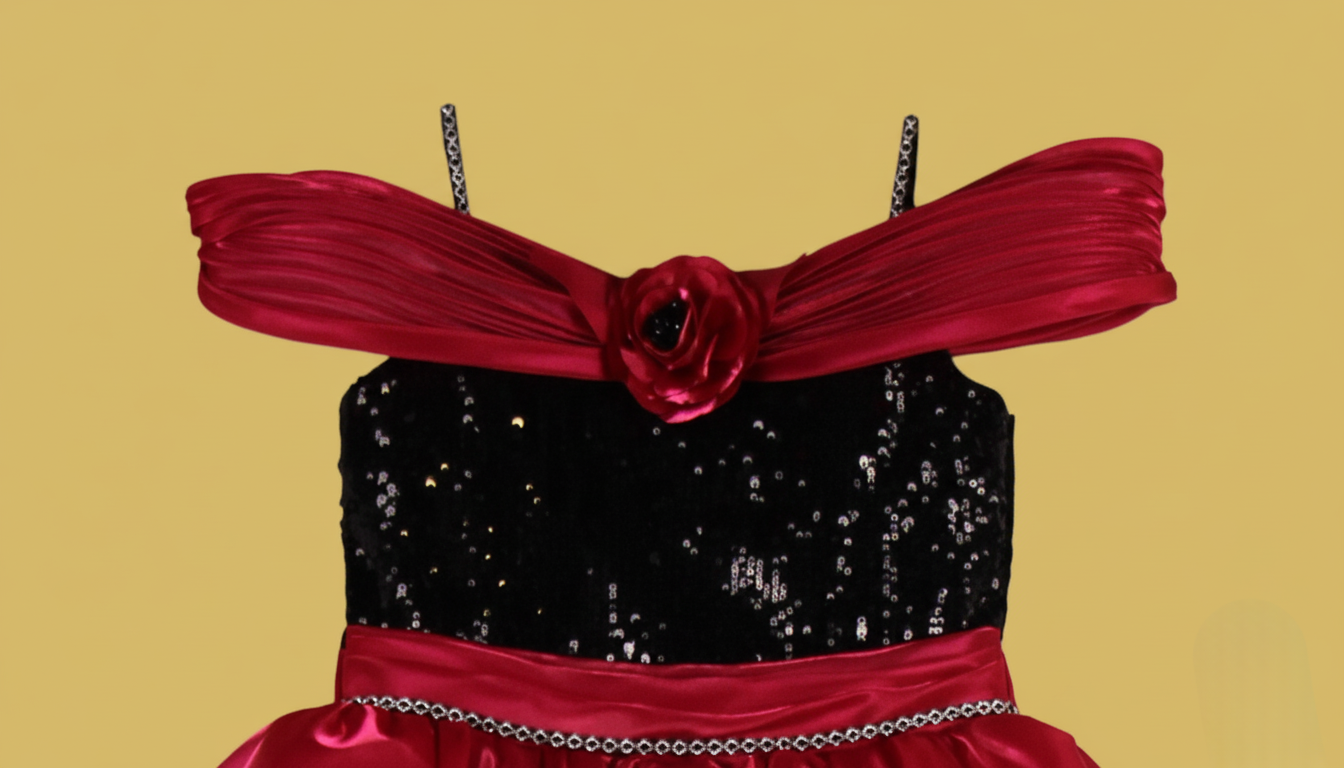 This elegant girl’s frock combines a bold color palette with sophisticated textures, making it a standout choice for parties and special occasions.