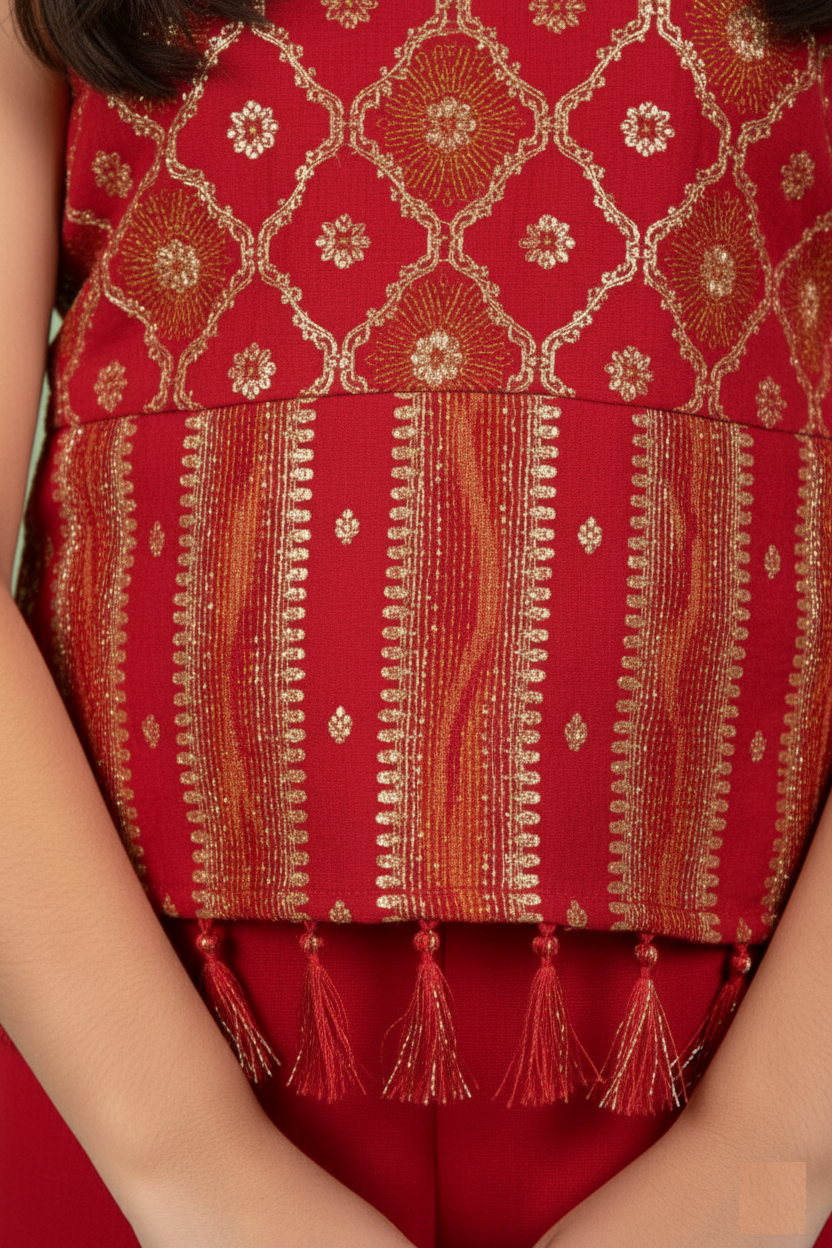 Hemline: Finished with matching red tassel fringe, which adds movement and texture to the outfit.