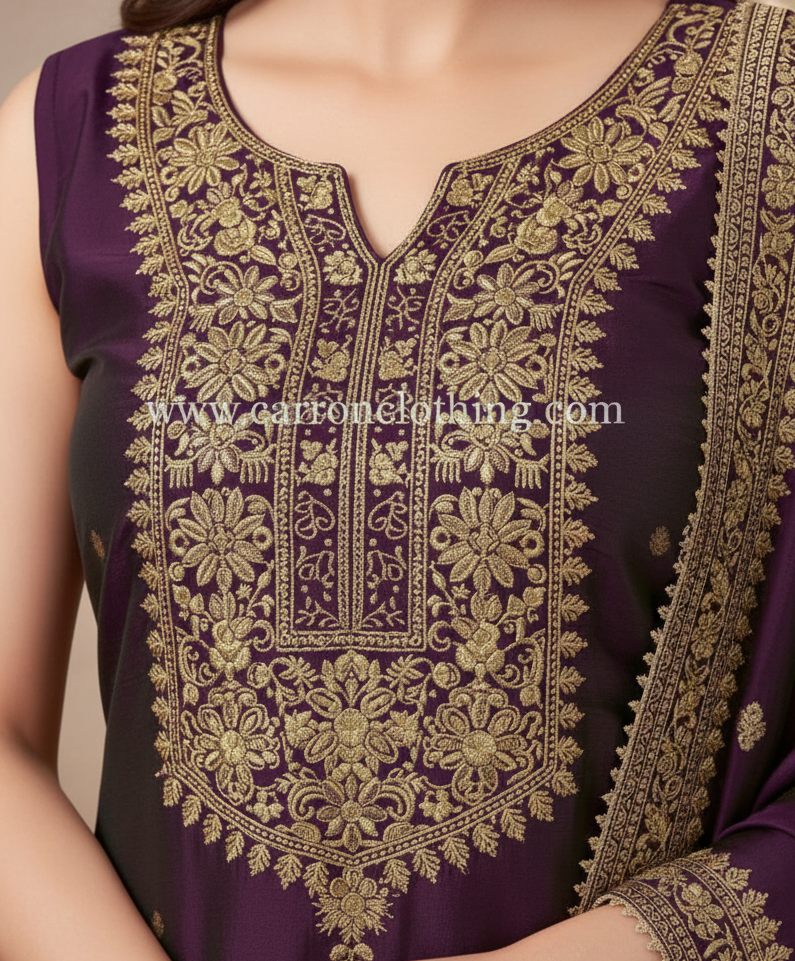 Embroidery: Features an intricate Zari embroidered yoke around a notched V-neckline.