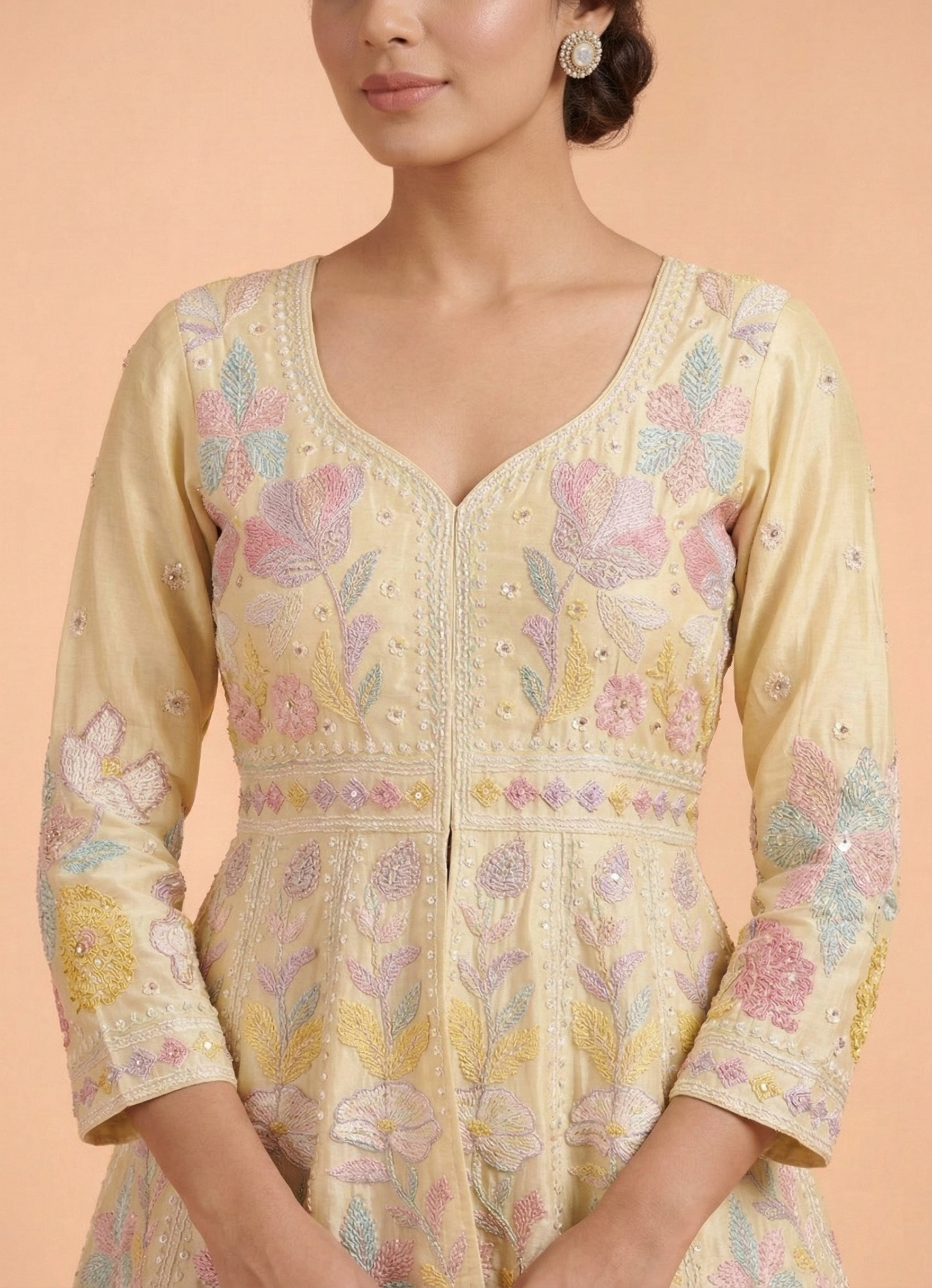 This elegant ensemble is a sophisticated take on contemporary Indian ethnic wear, featuring a soft pastel palette and delicate craftsmanship.