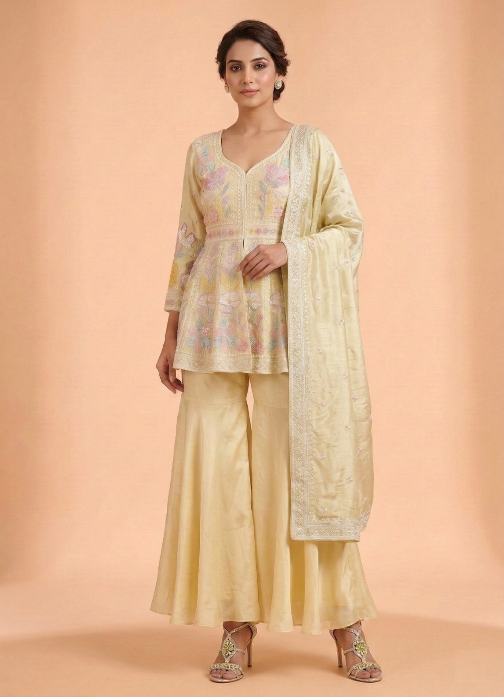 Components: Peplum Tunic, Flared Sharara Pants, and Matching Dupatta